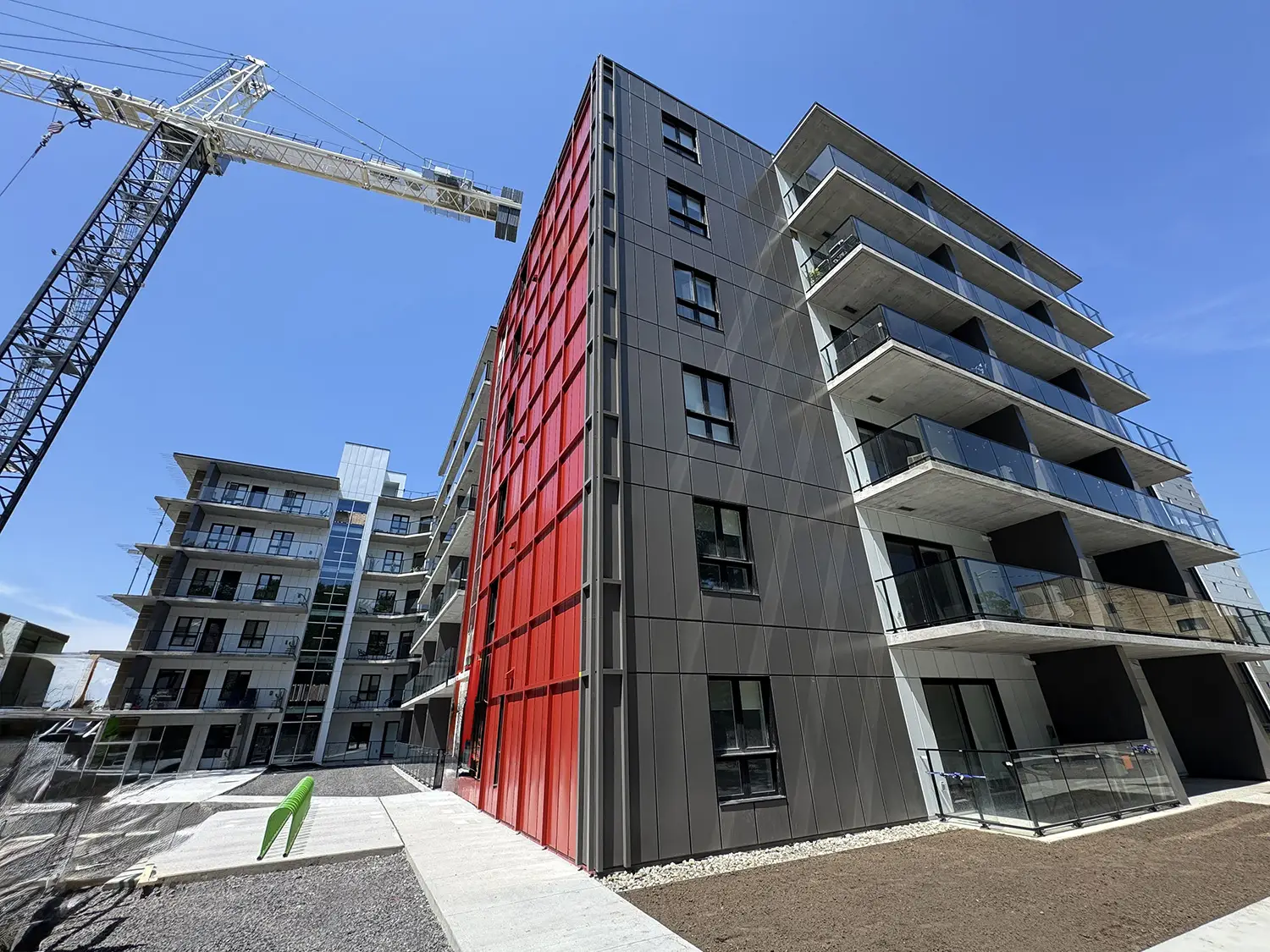 Les travaux de l'édifice 1 sur la rue Nérée-Tremblay, comprennent des logements de différents formats pour un total de 132 unités sur 6 étages ainsi que deux niveaux de stationnement souterrain.